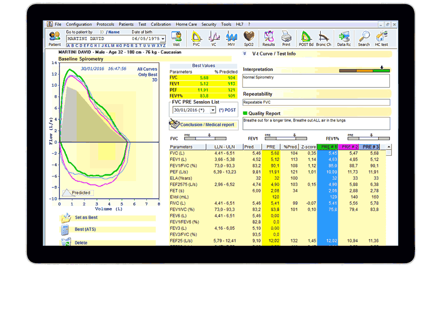 Σπιρομέτρηση με περισσότερες από 45 επιλέξιμες παραμέτρους συμπεριλαμβανομένων των εξετάσεων PRE και POST.
