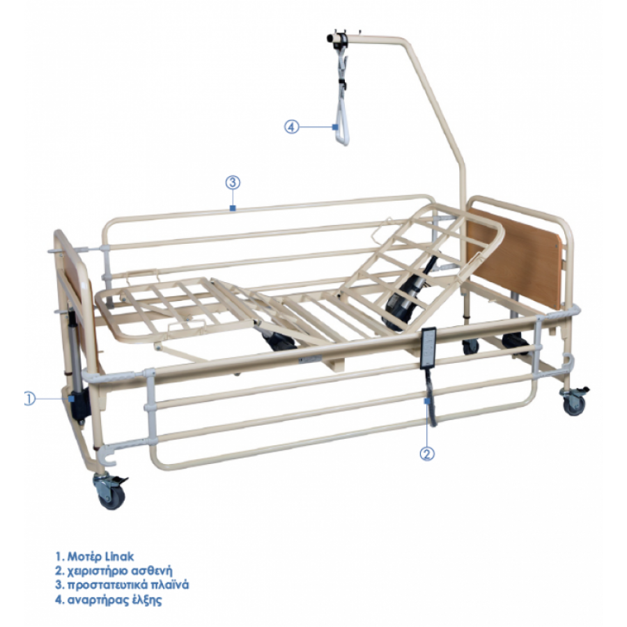 Πολύσπαστη ηλεκτρική κλίνη, με εσωτερική επένδυση ξύλου στις μετόπες. Μεταλλικό σώμα με μπάρες υποδο..
