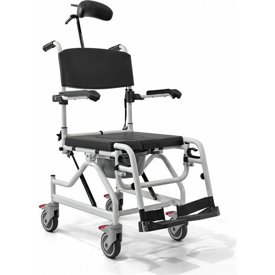 Τροχήλατη καρέκλα αλουμινίου με WC. Υδραυλική ανάκλιση καθίσματος (tilt) στην λαβή του συνοδού. Τέσσερις τροχοί με φρένο. Κάθισμα από αδιάβροχο pvc υλικό, με λεκανάκι WC και αφαιρούμενο κάλυπτρο.