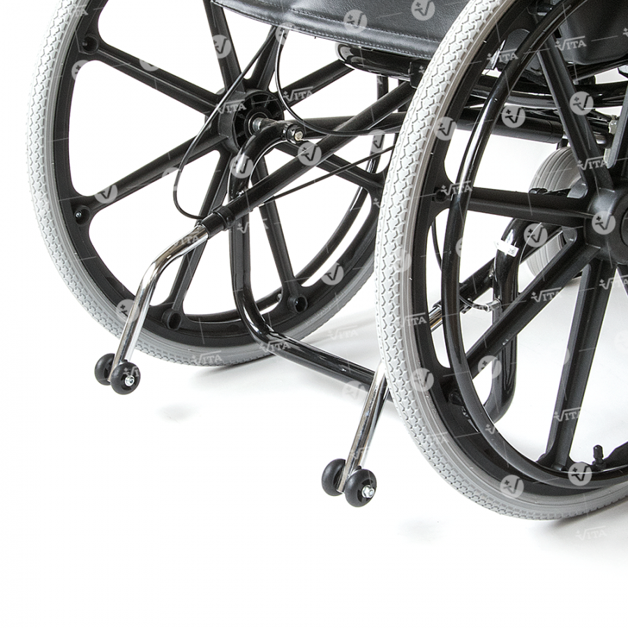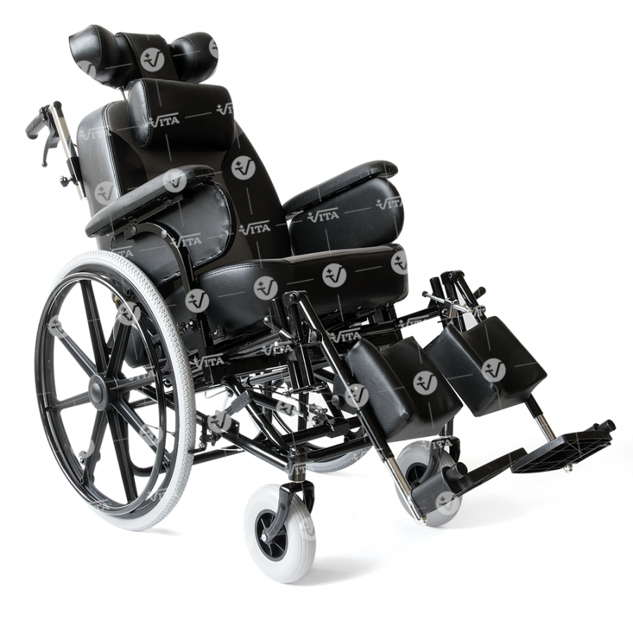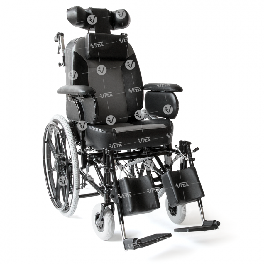 Μεταλλικός σκελετός ηλεκτροστατικής βαφής (“powder coating”). Ανακλινόµενη πλάτη, ρυθµιζόµενη και προσθαφαιρούµενη βάση στήριξης κεφαλής. Ανατοµικό µαξιλάρι αυχένα. Ρυθµιζόµενη γωνία (“tilt”) καθίσµατος και υποβραχιόνια ρυθµιζόµενου ύψους. Aνακλινόµενα και προσθαφαιρούµενα υποπόδια µε µαξιλαράκια στήριξης της γάµπας. Φρένα συνοδού. Mοχλός ρύθµισης θέσης καθίσµατος. Ροδάκια "Antitip".