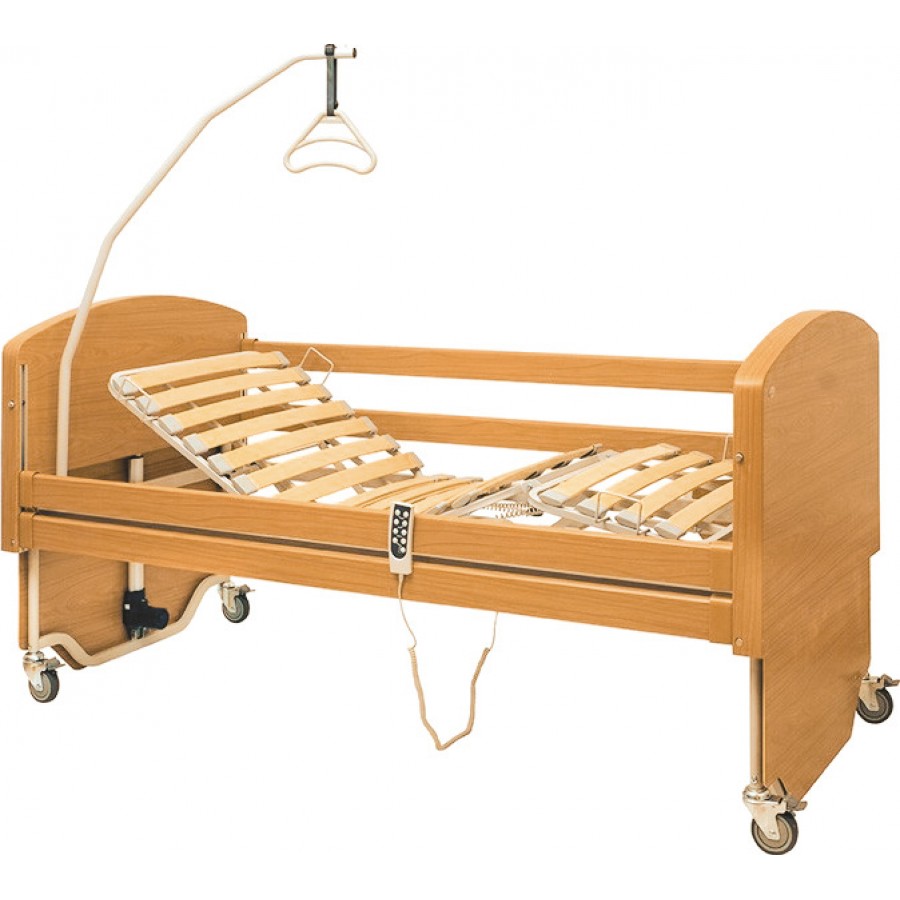Πολύσπαστη ηλεκτρική κλίνη, µε επένδυση ξύλου. Mεταλλικό σοµιέ µε παράλληλες ξύλινες µπάρες στήριξης του στρώµατος.