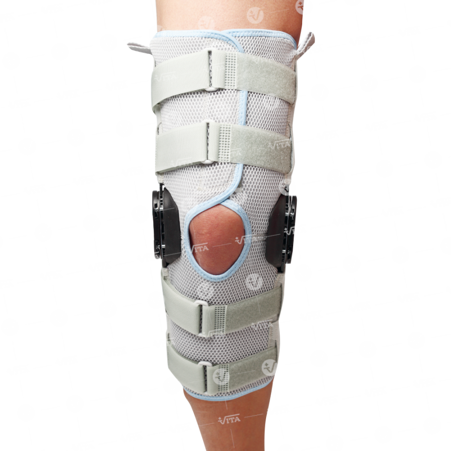 Κατασκευή από υλικό Νeoprene άριστης ποιότητας. Υπαλλεργικό και αντιεφιδρωτικό. Η ύφανση είναι δικτυωτή, από αεριζόμενες ίνες. Οι τέσσερις μη ελαστικοί ιμάντες που διαθέτει προσδίδουν πολύ καλή σταθεροποίηση. Φέρει πρόσθια οπή στην περιοχή του γόνατος, ενώ διαθέτει δύο πλάγιες μπανέλες αλουμινίου με πολυκεντρικές αρθρώσεις “ROM” κάμψης – έκτασης (0°, 15°, 30°, 60°, 90°) για την σταθεροποίηση των πλαγίων συνδέσμων. Ύψος 40 cm.