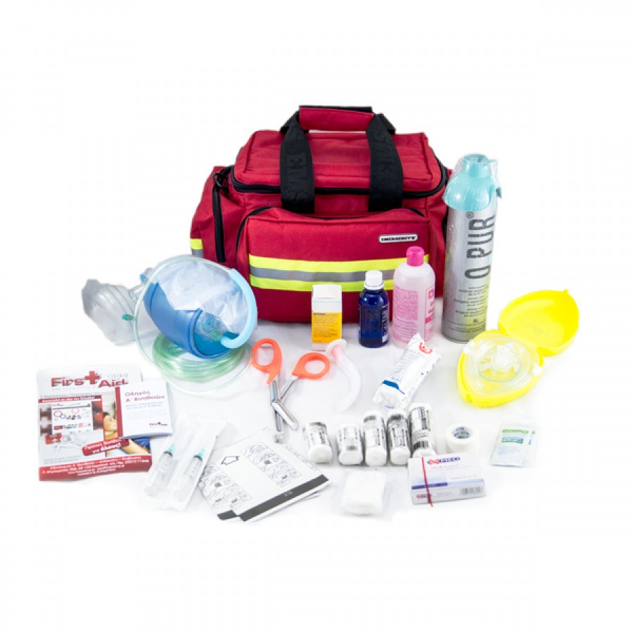 Είναι κατασκευασμένη από αδιάβροχο ύφασμα 600D Polyester με PVC. Πρακτική και ελαφριά τσάντα έκτακτης ανάγκης με δύο ρυθμιζόμενα εσωτερικά διαχωριστικά δημιουργούν 3 τμήματα για να κατανέμει ο χρήστης τον εξοπλισμό του όπως επιθυμεί. Με άνοιγμα από πάνω για να διευκολύνει την οργάνωση του υγειονομικού υλικού. Έχει, επίσης, τρεις θήκες, δύο εκ των οποίων είναι στα πλάγια και η άλλη είναι στο μπροστινό μέρος. Η μπροστινή θήκη διαχωρίζεται εσωτερικά με ελαστικούς ιμάντες για να μπορούν να τοποθετηθούν αντικείμενα, όπως ψαλίδια, σύριγγές κλπ.