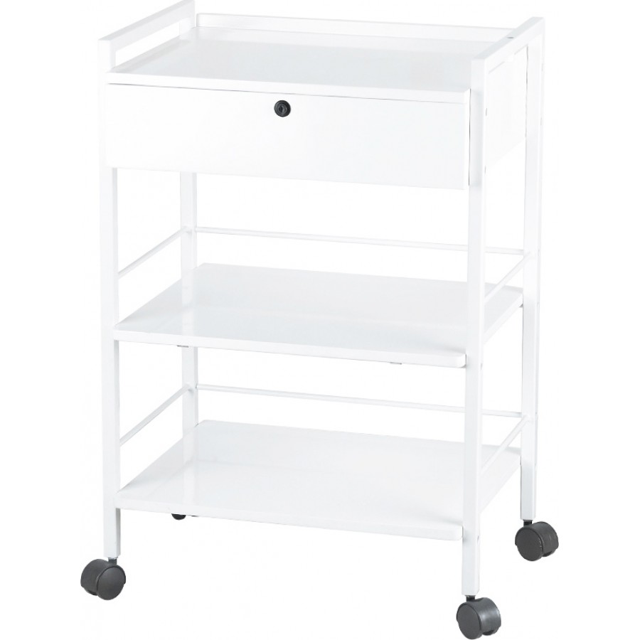 Λευκό τραπεζάκι με μεταλλική δομή που διαθέτει συρταριέρα και 3 ράφια για τοποθέτηση σε επιτραπέζιες συσκευές ή για την αποθήκευση εργαλείων φαρμάκων και άλλων ιατροφαρμακευτικών προϊόντων.