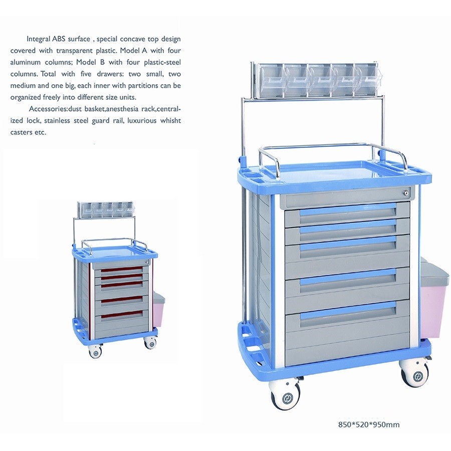 Επίσης διαθέτει ένα ράφι για τοποθέτηση φαρμάκων και άλλων ιατροφαρμακευτικών προϊόντων, προστατευτικό κιγκλίδωμα από ανοξείδωτο χάλυβα στην πίσω πλευρά, κεντρικό κλείδωμα για όλα τα ράφια, δύο δοχεία για απορρίμματα και μια λεία πλαστική επιφάνεια με λαβές για εύκολη μεταφορά.